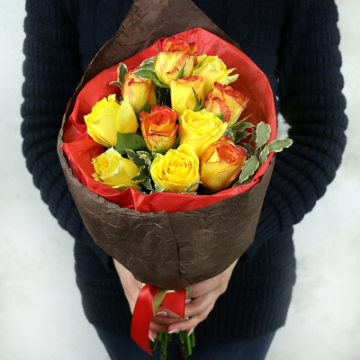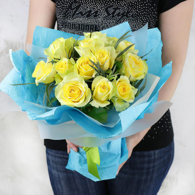 Букет из желтых роз с эвкалиптом в оригинальной упаковке| 3 900 Р | без скидки |
