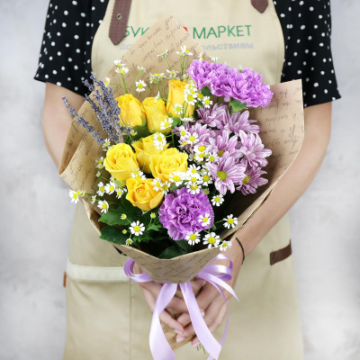 Роза Акция 30 см,Хризантема кустовая розовая ромашка,Ромашка (Танасетум),Гвоздика лунная фиолетовая,Лаванда сушёная,Упаковка в ассортименте,Лента,Плёнка прозрачная
