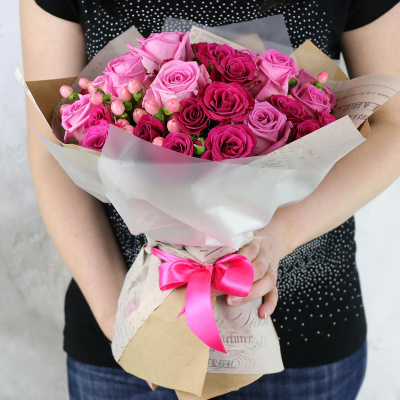 Букет из пионовидных роз, гиперикума и лизиантуса в крафте| 4 100 Р | без скидки |