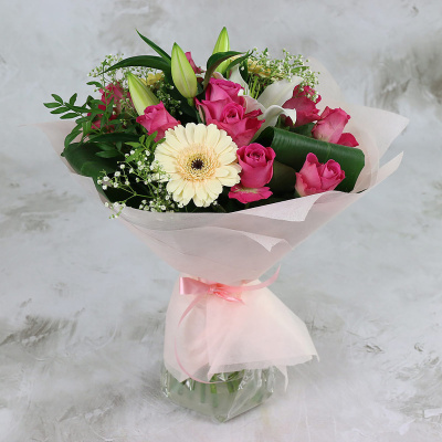 Букет из роз с герберами и лилией в упаковке| 4 500 Р | без скидки |