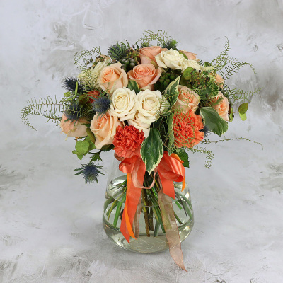 Букет из белых и персиковых роз с эрингиумом| 10 800 Р | без скидки |