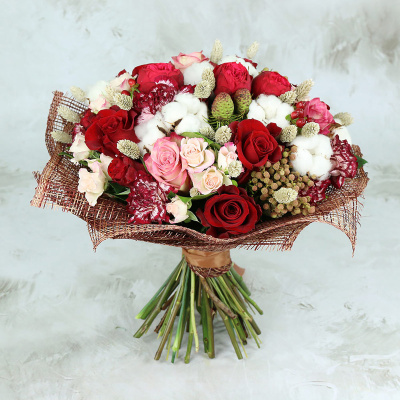 Букет из роз, гвоздики и хлопка в упаковке| 12 000 Р | без скидки |
