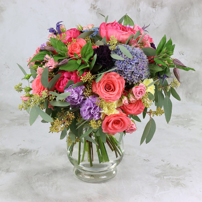 Роза кустовая 60 см кремовая, Гвоздика лунная фиолетовая, Гортензия белая, Пион коралловый, Клематис фиолетовый, Гвоздика оранжевая, Роза Эквадор 60 см розовая, Листья эвкалипт с яг/цв/краш, Лента, Плёнка прозрачная