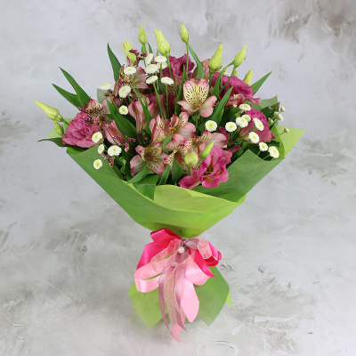 Букет из розовых альстромерии и лизиантуса в упаковке| 4 600 Р | без скидки |