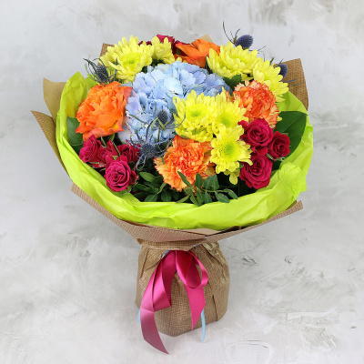 Гортензия, Роза 40 см розовая, Роза кустовая 50 см оранжевая, Эрингиум, Гвоздика оранжевая, Листья фисташки, Листья салал, Хризантема кустовая желтая, Бумага упаковочная Крафт, Бумага упаковочная Тишью, Лента, Плёнка прозрачная