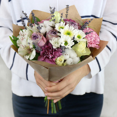 Роза 40 см розовая, Гвоздика оранжевая, Альстромерия желтая, Роза кустовая Клустер кремовая, Хлопок, Хризантема кустовая желтая, Лаванда сушёная, Листья салал, Бумага упаковочная Крафт, Лента, Плёнка прозрачная