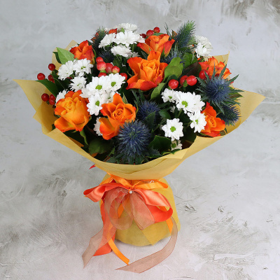 Букет из роз, хризантем и эрингиума в упаковке| 5 600 Р | без скидки |