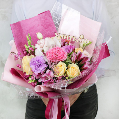 Букет из роз и гвоздик с деревянной вставкой Учителю| 6 500 Р | без скидки |