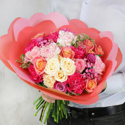 Гвоздика оранжевая, Роза 40 см розовая, Роза РС 60 см коралловая, Роза кустовая 40 см розовая, Роза Эквадор 60 см розовая, Бовардия фиолетовая, Листья питтоспорума микс, Упаковка в ассортименте, Лента, Плёнка прозрачная