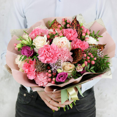 Гвоздика лунная фиолетовая, Гвоздика лунная фиолетовая, Роза Эквадор 60 см розовая, Эрика, Листья фисташки, Листья салал, Листья аукуба, Капс, Гиперикум красный, Лизиантус, Упаковка в ассортименте, Лента, Плёнка прозрачная