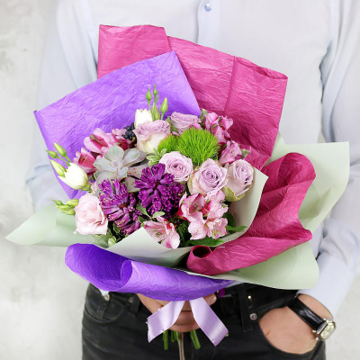 Роза кустовая 40 см розовая, Роза 40 см розовая, Гвоздика лунная фиолетовая, Гвоздика лунная фиолетовая, Гвоздика лунная фиолетовая, Листья фисташки, Упаковка в ассортименте, Листья эвкалипт с яг/цв/краш, Лента, Плёнка прозрачная