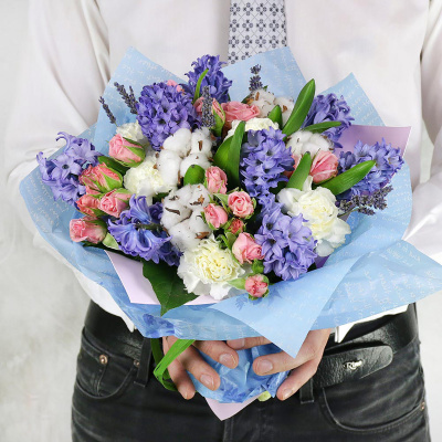 Букет Тельцу из гиацинтов, гвоздик и роз с хлопком| 6 200 Р | без скидки |