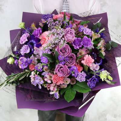 Маттиола кремовая, Роза Эквадор 60 см розовая, Листья аспидистра, Анемон синий, Сирень фиолетовая, Лизиантус, Роза Оушен сонг 40 см - 50 см, Альстромерия желтая, Бовардия фиолетовая, Гвоздика лунная фиолетовая, Хризантема сантини зеленая, Фрезия белая, Гвоздика оранжевая, Листья эвкалипт микс, Листья салал, Листья олива, Вибурнум тинус (пучок), Упаковка в ассортименте, Лента, Плёнка прозрачная