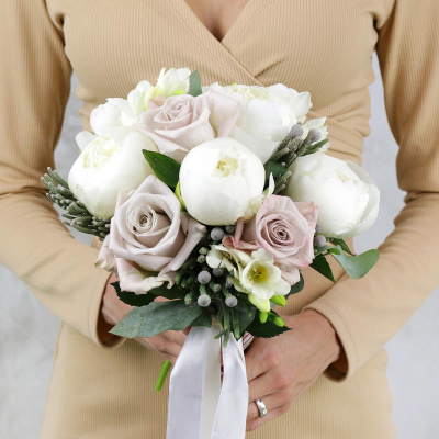 Пион коралловый, Фрезия белая, Роза Гринроуз 60 см фиолетовая, Капс Бруниа, Листья эвкалипт микс, Лента, Плёнка прозрачная