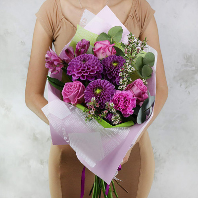 Хризантема куст. ВС фиолетовая, Маттиола кремовая, Гвоздика лунная фиолетовая, Тюльпан малиновый, Роза Оушен сонг 40 см - 50 см, Хлопок, Гипсофила, Листья фисташки, Упаковка в ассортименте, Лента, Плёнка прозрачная