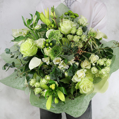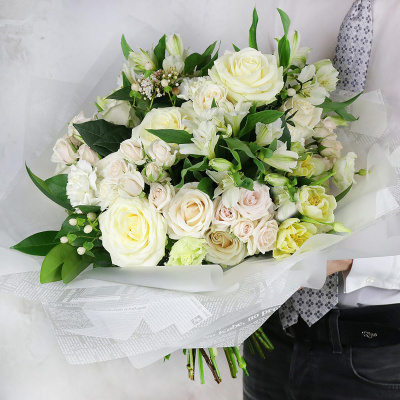 Нежный букет из роз, тюльпанов, гвоздик и лизиантусов с листьями фисташки| 15 800 Р | без скидки |