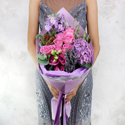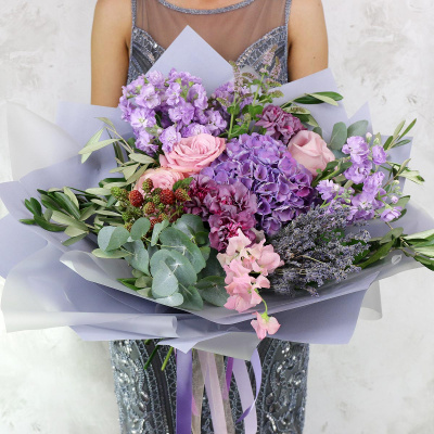 Роза Гринроуз 60 см фиолетовая, Маттиола кремовая, Мята, Гвоздика оранжевая, Ежевика (Рубус), Гортензия белая, Латирус фиолетовый, Лаванда сушёная, Листья олива, Листья эвкалипт микс, Упаковка в ассортименте, Лента, Плёнка прозрачная