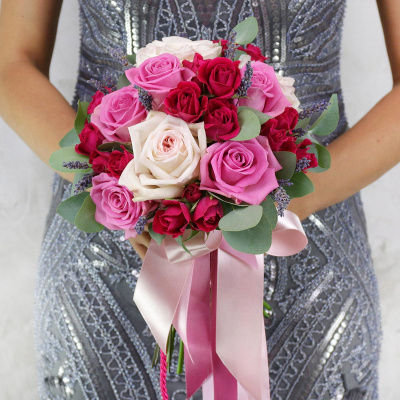 Роза Гринроуз 60 см фиолетовая, Роза РС 60 см коралловая, Роза кустовая 40 см розовая, Листья эвкалипт микс, Лаванда сушёная, Лента, Плёнка прозрачная