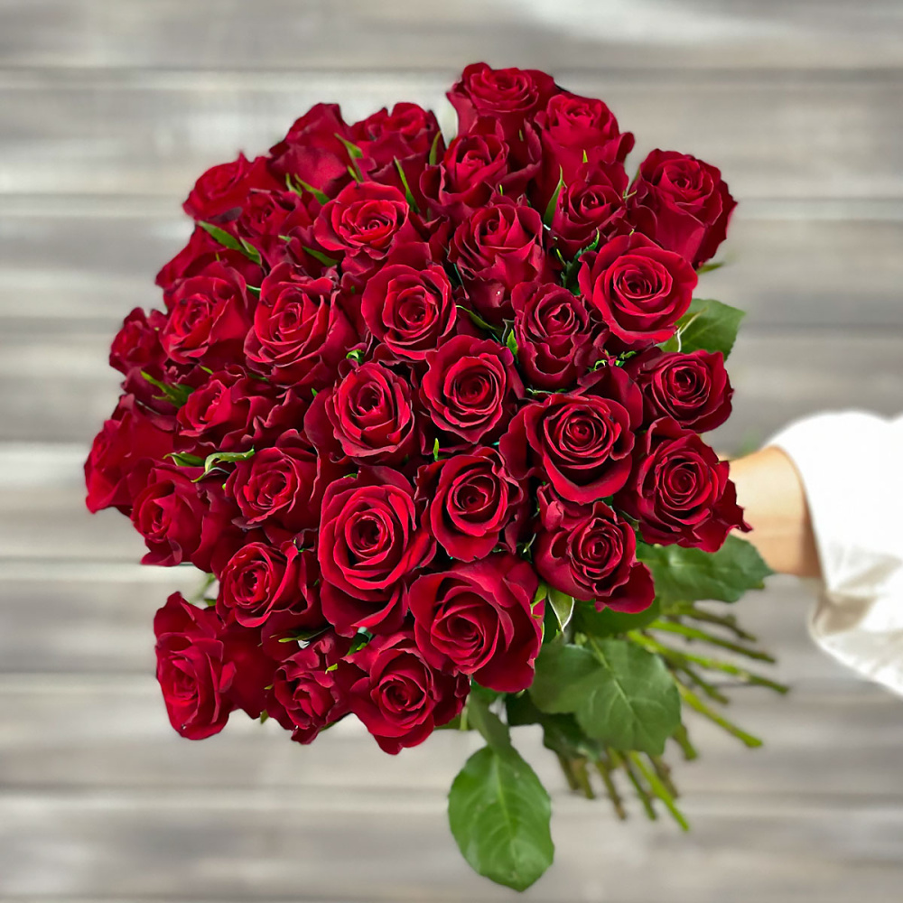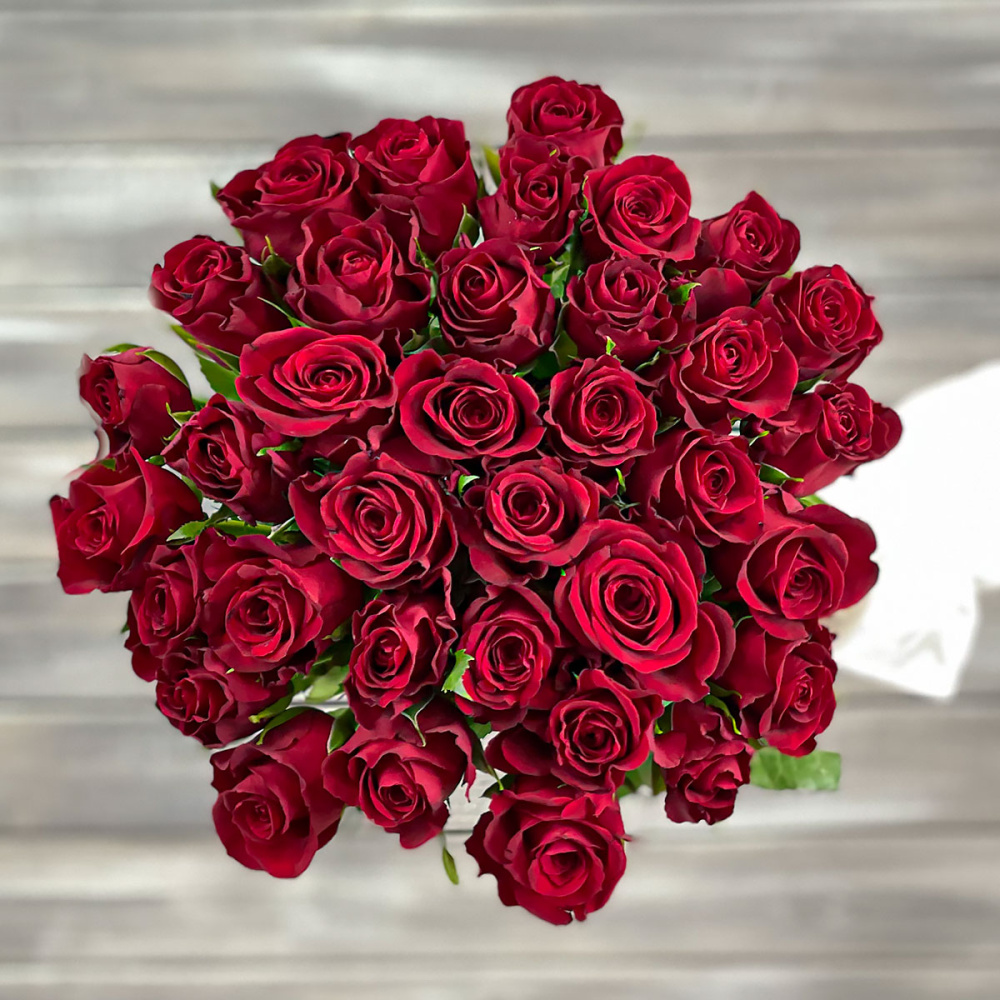 Букет из 25 красных роз с лентой Кения 40 см.
