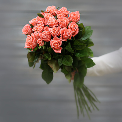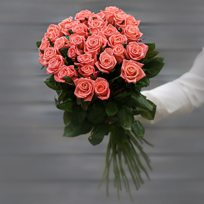 Букет из 23 коралловых роз (Россия) с лентой 60 см| 4 700 Р | без скидки |
