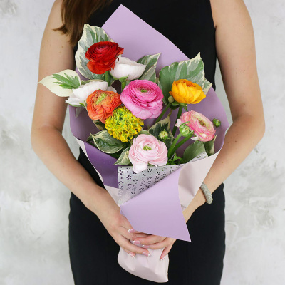 Букет из 9 разноцветных ранункулюсов и листьев хедеры8 980 Р