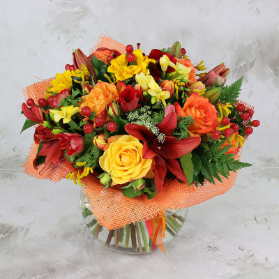 Букет Овну из лилий, роз, анемонов и тюльпанов с листьями хедеры| 21 000 Р | без скидки |