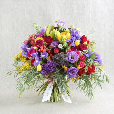 Тюльпан малиновый, Трахелиум фиолетовый, Лизиантус, Брассика, Анигозантус, Ирис, Роза кустовая 50 см оранжевая, Гиперикум красный, Леукадендрон микс, Целозия оранжевая, Роза кустовая Клустер кремовая, Краспедия, Мимоза цветущая, Капс, Гвоздика оранжевая, Листья эвкалипт микс, Гипсофила, Вибурнум тинус (пучок), Упаковка ББ