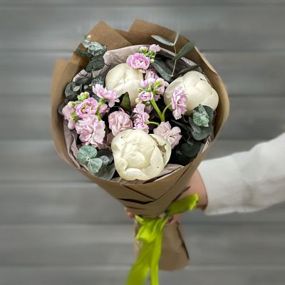 Пион высший сорт,Маттиола кустовая ,Листья эвкалипт микс,Листья фисташки,Бумага упаковочная Крафт,Лента,Бумага упаковочная Тишью,Плёнка прозрачная