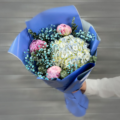 Букет из гортензии, пионов и гипсофилы| 5 100 Р | без скидки |