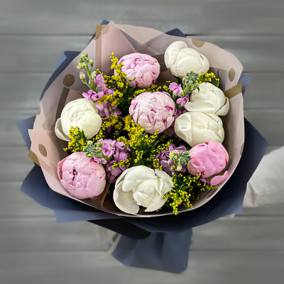 Пион высший сорт,Маттиола кустовая ,Солидаго микс,Листья фисташки,Лента,Упаковка в ассортименте,Плёнка прозрачная