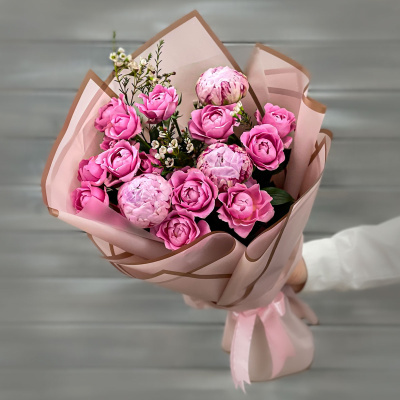 Букет из пионовидных роз, пионов и хамелациума| 5 400 Р | без скидки |