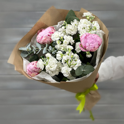 Букет из белых пионов и розовых маттиол| 5 200 Р | без скидки |