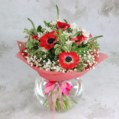 Букет из красных анемонов и гипсофилы в упаковке| 12 400 Р | без скидки |