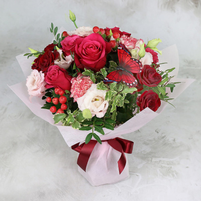 Роза Эквадор 60 см розовая, Лизиантус, Гиперикум красный, Гвоздика оранжевая, Роза кустовая 50 см оранжевая, Листья эвкалипт микс, Листья фисташки, Бабочка, Упаковка из фетра, Лента, Плёнка прозрачная
