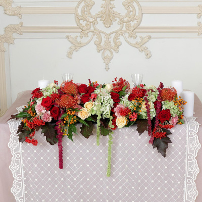 Гортензия белая, Листья питтоспорума микс, Нутан, Листья дуба (шт), Амарантус, Гвоздика лунная фиолетовая, Вибурнум ягоды (ШТ), Бовардия фиолетовая, Роза РС 50 см красная, Роза РС 40 см кремовая, Оазис кирпич, Оазис Поддон двойной для кирпича (49х12х3), Поддон для кирпича 25*13*3 см, Лента, Плёнка прозрачная