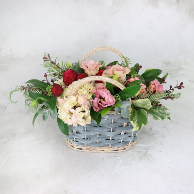 Композиция из гортензий, роз, озатанмуса в плетеной корзинке| 9 400 Р | без скидки |