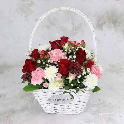 Композиция из роз, гвоздик и лаванды в корзине| 5 300 Р | без скидки |