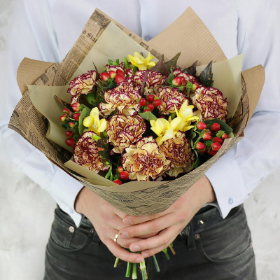 Букет из гвоздик, гиперикумов и фрезий| 3 490 Р | без скидки |