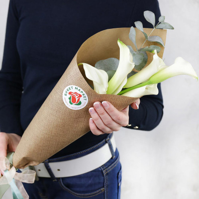 Букет из 5 белых калл и эвкалипта в крафте| 4 300 Р | без скидки |