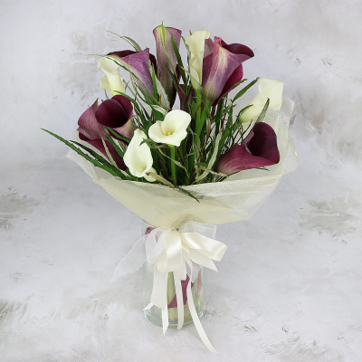 Букет из 15 малиновых и белых калл| 8 200 Р | без скидки |