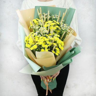 Хризантема кустовая желтая махровая,Ромашка (Танасетум),Тритикум пшеница (Сушеный),Упаковка в ассортименте,Лента,Плёнка прозрачная