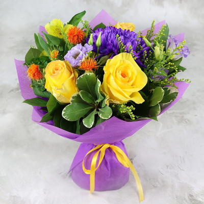 Хризантема одноголовая розовая, Гвоздика оранжевая, Альстромерия желтая, Роза РС 50 см красная, Роза кустовая 50 см оранжевая, Листья эвкалипт с яг/цв/краш, Листья салал, Упаковка в ассортименте, Лента, Плёнка прозрачная