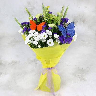 Хризантема сантини зеленая, Гвоздика кустовая белая, Солидаго микс, Статица, Тритикум свежий, Листья салал, Декор Бабочки, Упаковка из фетра, Лента, Плёнка прозрачная